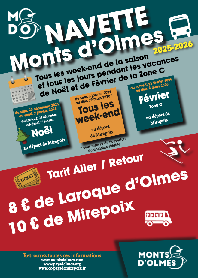 Comme les saisons précédentes, Les communauté de communes du Pays d'Olmes et du Pays de Mirepoix mettent en place la navette à destination de la station des Monts d'Olmes.